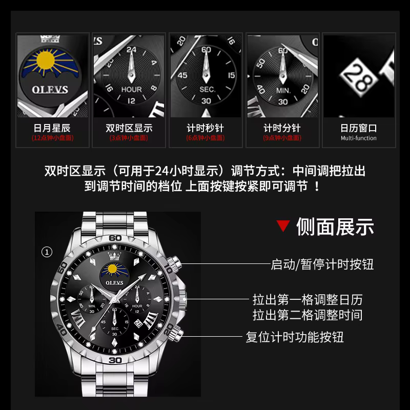 Feature: Shock Resistant,Luminous,Chronograph,Complete Calendar,Moon Phase,Multiple Time Zone,Water Resistant,swim,Week Display,luminous hands